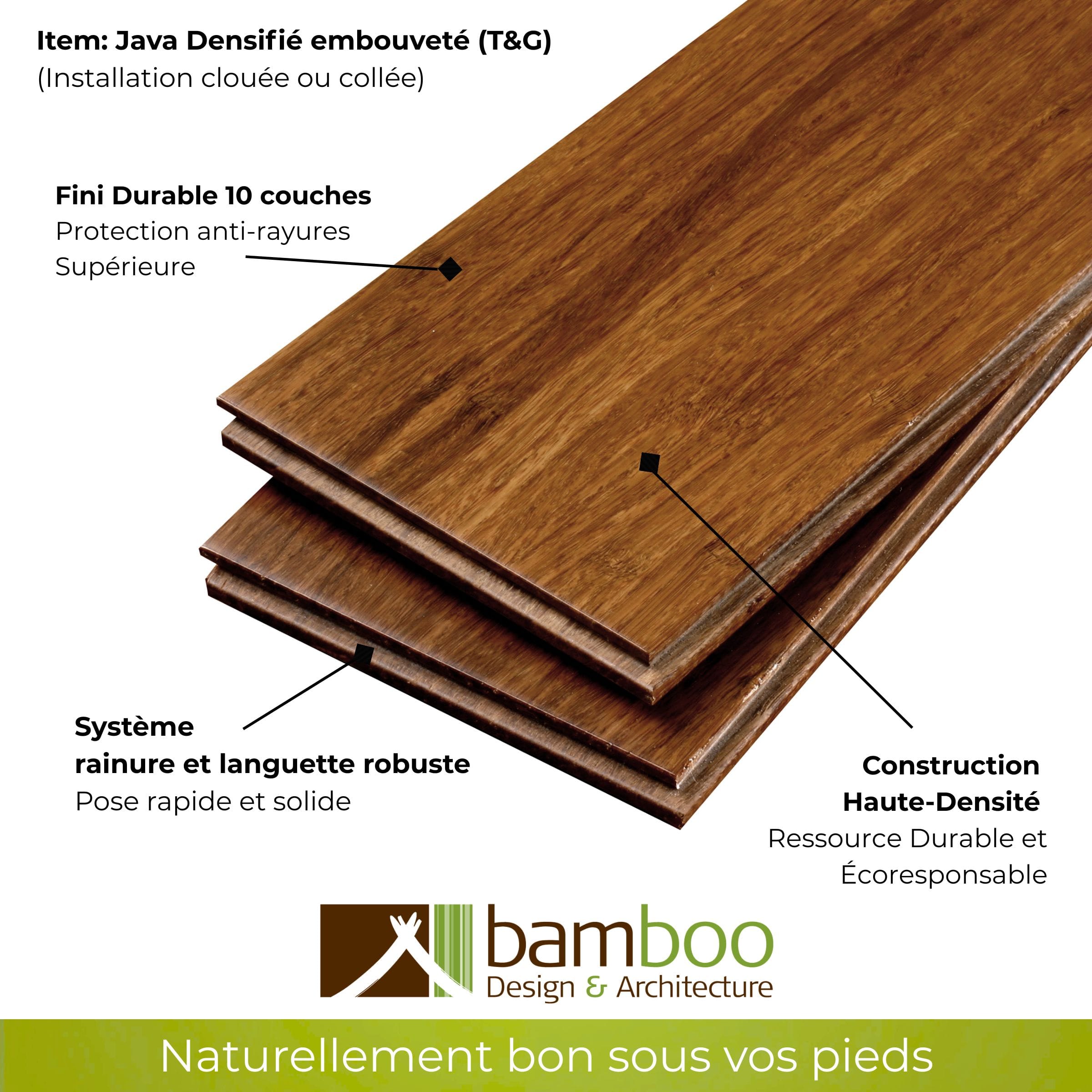 En combinant le bambou strand Densifié™ avec une protection supplémentaire de 10 couches ultra résistantes, nous créons des planchers qui non seulement résistent aux rigueurs du temps mais aussi aux défis de la vie quotidienne. Ces planchers sont conçus pour être compatibles avec tous types de chiens et peuvent supporter les talons hauts sans dommage. En outre, ils se démarquent par leur absence d’émissions toxiques et d’urée de formaldéhyde, offrant ainsi une sécurité maximale pour la qualité de l’air intérieur et la santé de votre famille. En tant que planchers les plus robustes disponibles, les Planchers Densifié™ de Bamboo Design allient durabilité et sécurité, faisant d’eux le choix idéal pour un environnement sain et durable.