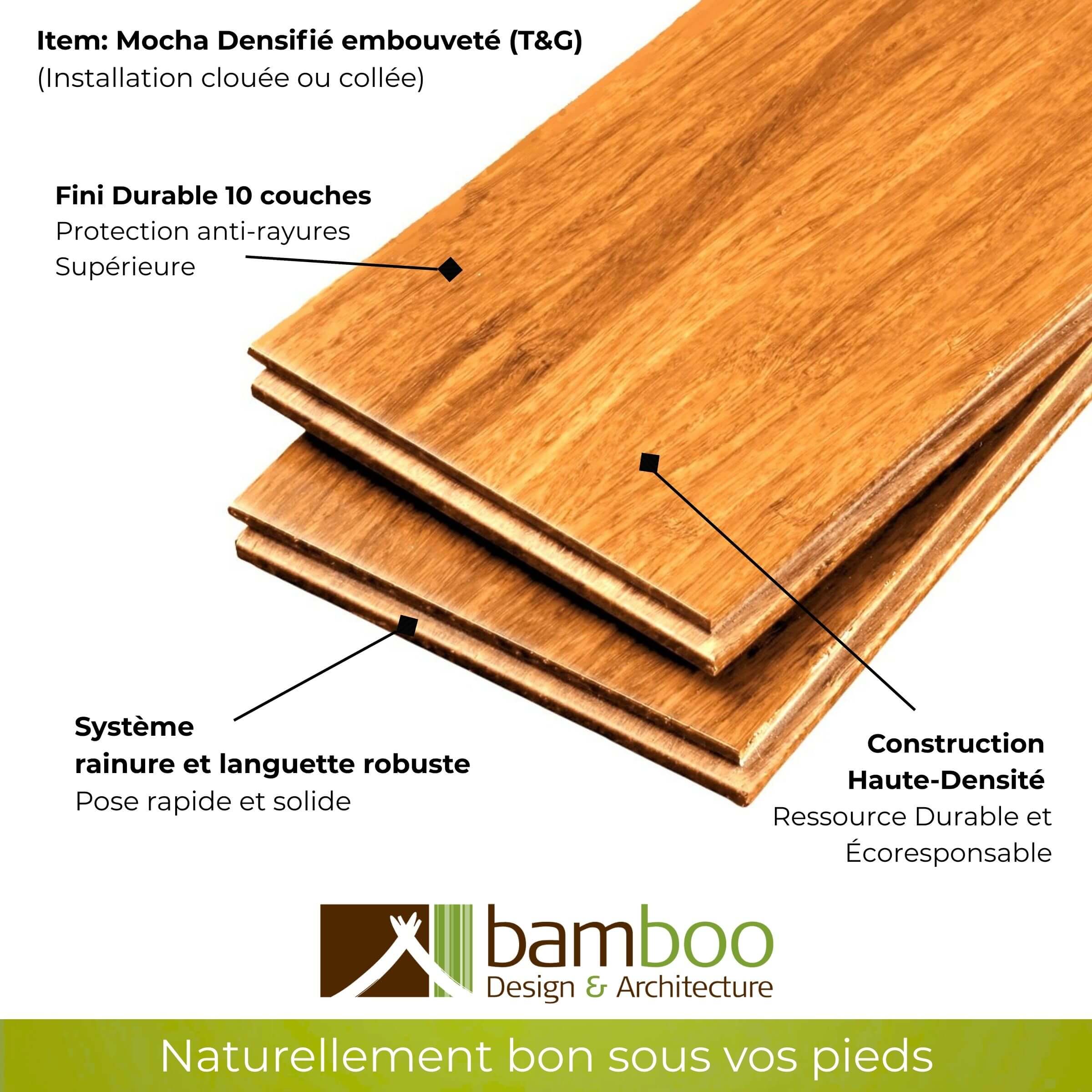 En combinant le bambou strand Densifié™ avec une protection supplémentaire de 10 couches ultra résistantes, nous créons des planchers qui non seulement résistent aux rigueurs du temps mais aussi aux défis de la vie quotidienne. Ces planchers sont conçus pour être compatibles avec tous types de chiens et peuvent supporter les talons hauts sans dommage. En outre, ils se démarquent par leur absence d’émissions toxiques et d’urée de formaldéhyde, offrant ainsi une sécurité maximale pour la qualité de l’air intérieur et la santé de votre famille. En tant que planchers les plus robustes disponibles, les Planchers Densifié™ de Bamboo Design allient durabilité et sécurité, faisant d’eux le choix idéal pour un environnement sain et durable.